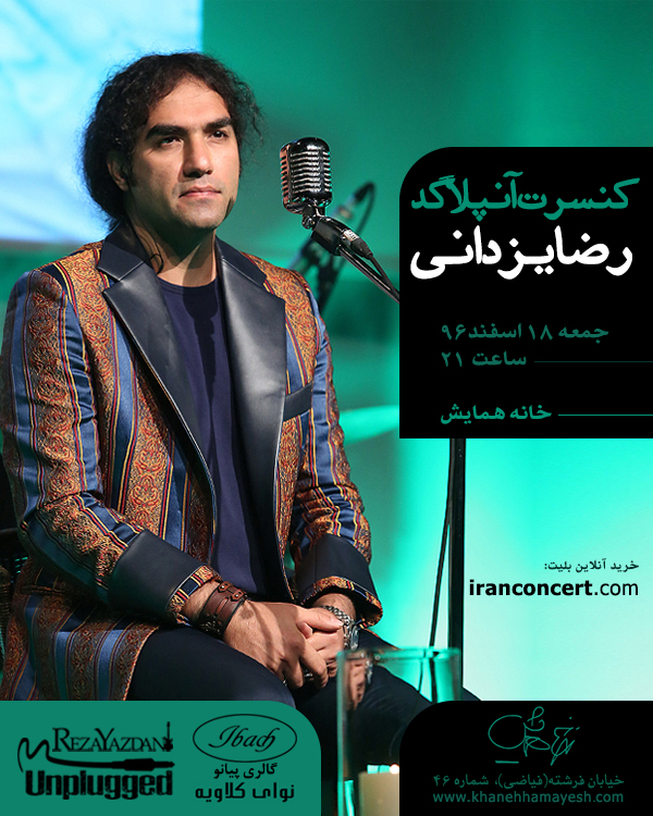 کنسرت آنپلاگد رضایزدانی در تهران اجرا خواهد شد. زمان: ساعت ۲۱ / جمعه ۱۸ اسفند ۹۶ مکان: خانه همایش (فرشته، شماره ۴۶)